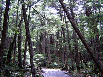 道路から林へと入っていくと、そこはまるで「もののけ姫」の世界のようです。遊歩道の回りは樹齢数百年もあろうかというコメツガ、トウヒ、オオシラビソの亜高山帯針葉樹林となっています。