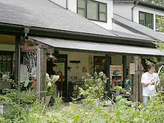 八ヶ岳倶楽部の施設としては、レストラン、ギャラリー、ステージがあります。ここはギャラリーの建物です。中には、色々な作家の方々の木工や鉄製、ガラス製の作品が展示・販売されています。直ぐ脇の中庭には、様々な植物が植えられていて、寄せ植えや苗、園芸用品などが販売されています。