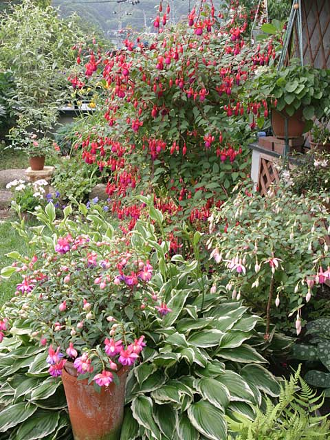 庭植にしたスタンダード2つ。 奥の品種名はMultaですが、6年前に手に入れたフクシアで、私の所にあるフクシアでは育てやすさで5本の指に入ります。また、初めてスタンダード仕立てに挑戦したフクシアでもあります。 手前の小さいフクシアは、Put Follyで挿し木してから2年くらいです。